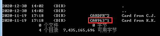 1、使用cmd命令行工具,进入到“.”结尾的文件夹(下面以“Card from K.K.”为例)所在的目录,然后执行命令:dir /x,这样就可以查看到倒数第二列“Card from K.K.”文件夹的短名称“CA8963~1”。