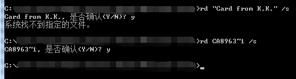 2、继续执行命令:rd CA8963~1 /s,即通过短名称来删除该文件夹就可以成功,s参数代表删除文件夹下包含的子文件。如果这里直接用文件夹名去删除,也会提示“系统找不到指定文件”。