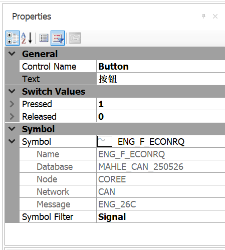 Button控件在使用的时候有两个状态,按下和松开,在右侧的Properties 中可以给该控件指定信号,并设置按下和松开状态下的值,如下图: