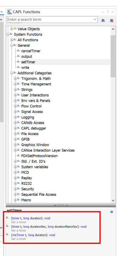 在CAPL Functions小窗口选择函数名,下方可看到函数的接口定义,如下图: