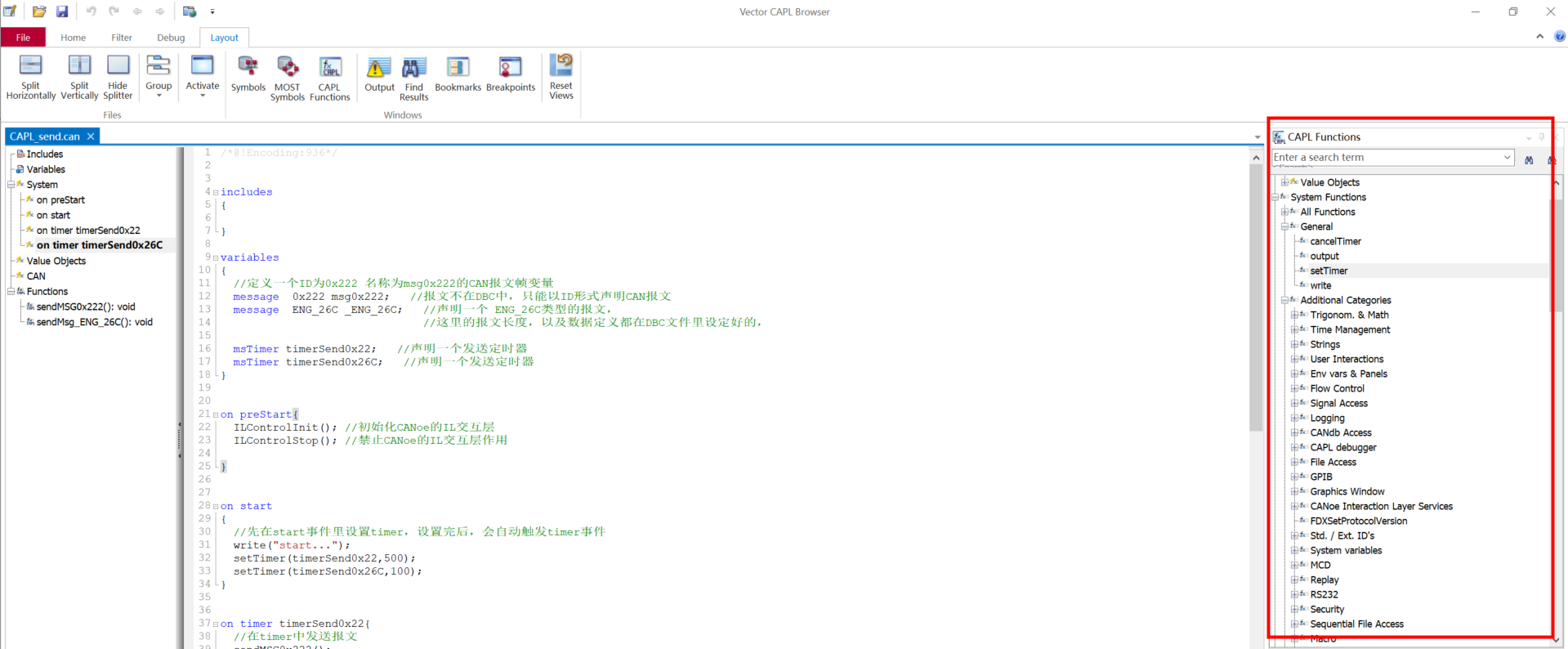 点击CAPL Functions后界面右侧会出现CAPL Functions小窗口,如下图: