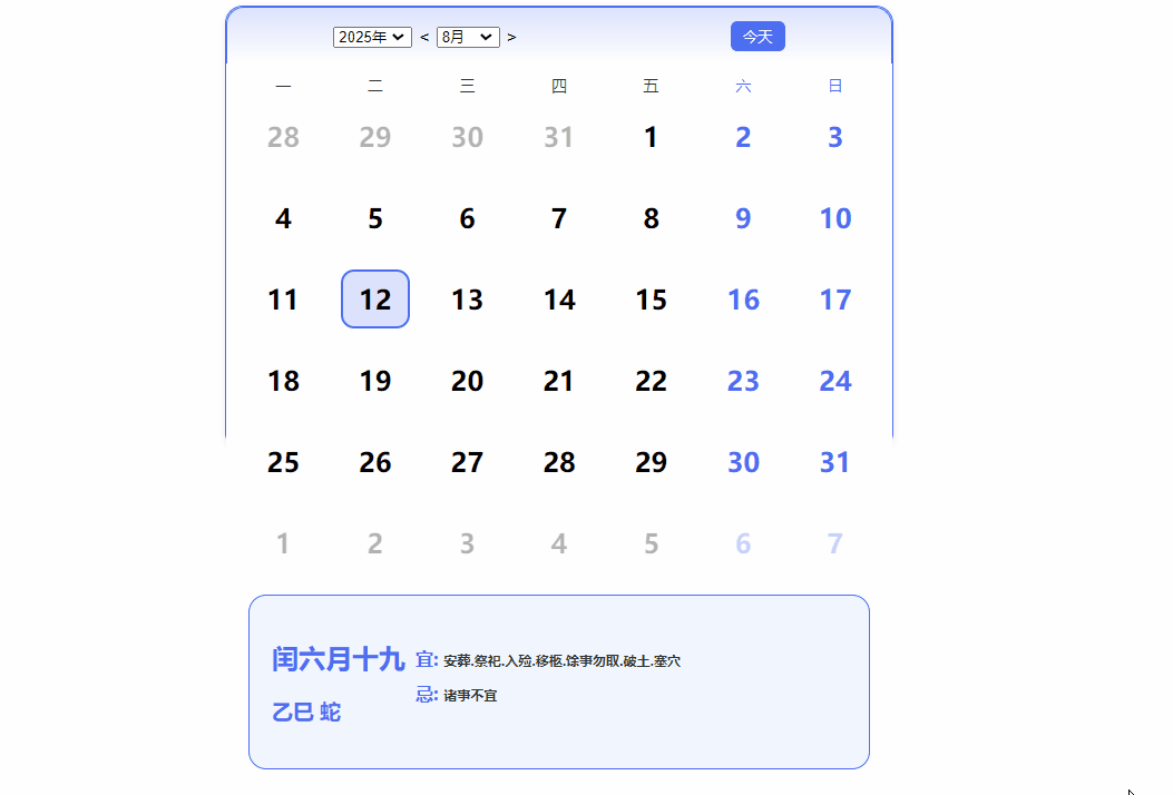 基于 Vue 3 + Vite + Pinia 构建的现代化万年历应用,提供公历、农历信息以及每日宜忌查询功能。