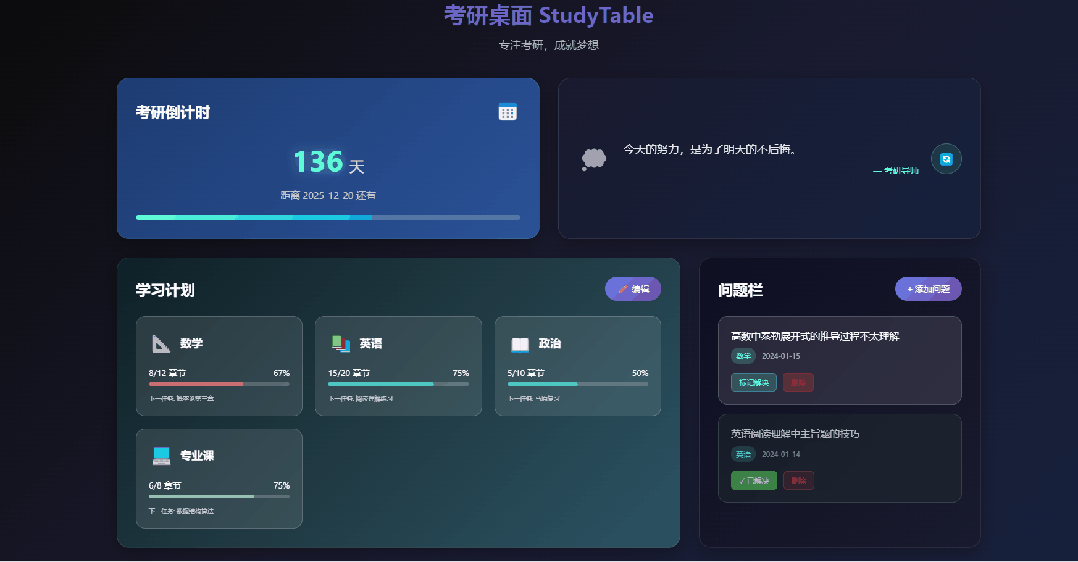AI学习桌是一个集成了学习计划管理、每日打卡、问题记录、励志语录等功能的综合性学习管理平台。通过智能化的数据分析和可视化的学习进度展示,帮助考研学生更好地规划和管理自己的学习过程。