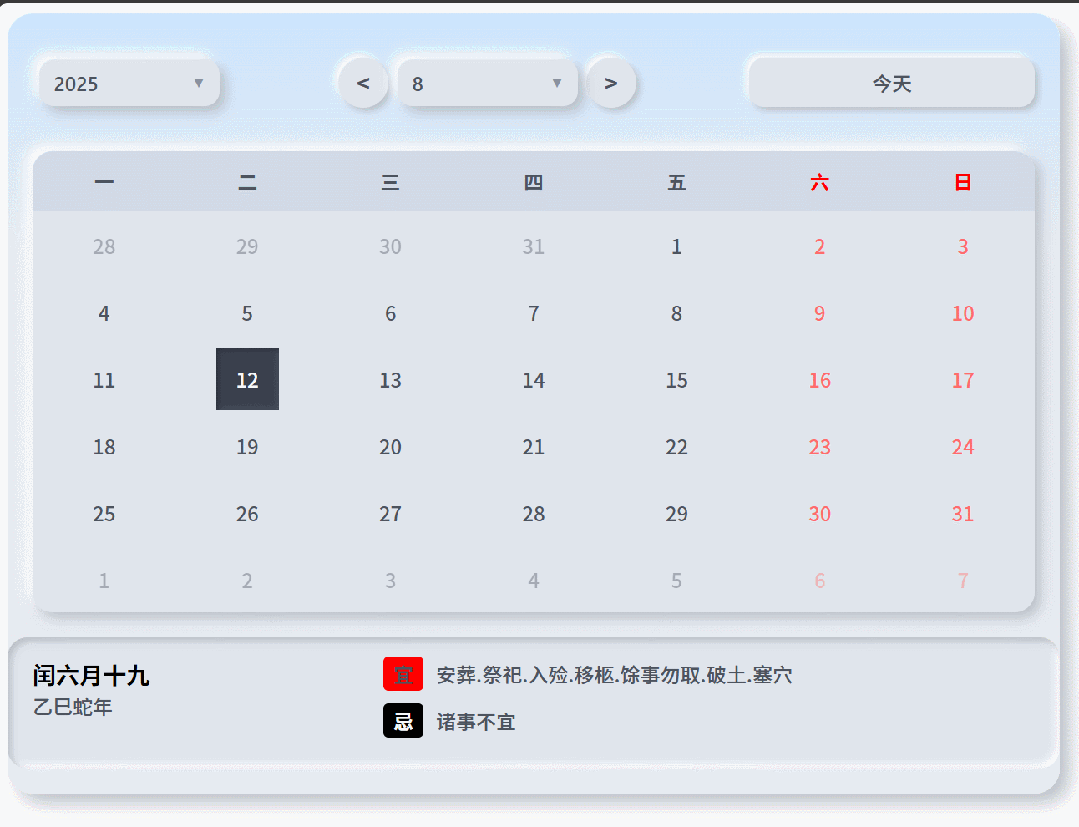 一个采用新拟物化设计风格(Neumorphic Design)的现代化万年历应用,基于 Vue 3 和 Vite 构建。