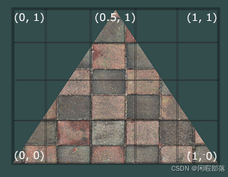 我们为三角形指定了3个纹理坐标点。如上图所示,我们希望三角形的左下角对应纹理的左下角,因此我们把三角形左下角顶点的纹理坐标设置为(0, 0);三角形的上顶点对应于图片的上中位置所以我们把它的纹理坐标设置为(0.5, 1.0);同理右下方的顶点设置为(1, 0)。我们只要给顶点着色器传递这三个纹理坐标就行了,接下来它们会被传片段着色器中,它会为每个片段进行纹理坐标的插值。