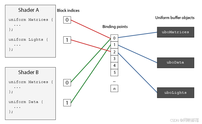 在OpenGL环境(context)中,定义了若干绑定点(binding points),在哪儿我们可以把一个uniform缓冲链接上去。当我们创建了一个uniform缓冲,我们把它链接到一个这个绑定点上,我们也把着色器中uniform块链接到同一个绑定点上,这样就把它们链接到一起了。下面的图标表示了这点: