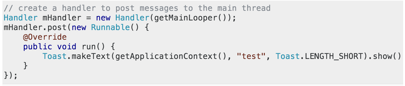 (大意翻译: 原因是你在一个由intentService控制生命周期的线程种创建了toast,手机先会显示这个toast,之后还是用这个线程的handler去隐藏&关闭这个toast;但是当onHandleIntent结束的时候,这个线程就挂了,然后绑定在这个线程上的handler也就不存在了,完事儿这个toast就关闭不了了,怎么办呢?发给主线程吧,它的toast的Handeler还存活,可以隐藏toast)