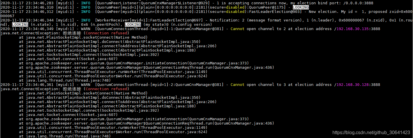 2020-11-17 23:36:44,466 [myid:1] - WARN [QuorumConnectionThread-[myid=1]-5:QuorumCnxManager@381] - Cannot open channel to 3 at election address /192.168.30.128:3888【这个时候因为server-3没有启动,所以还在报连不上节点3】