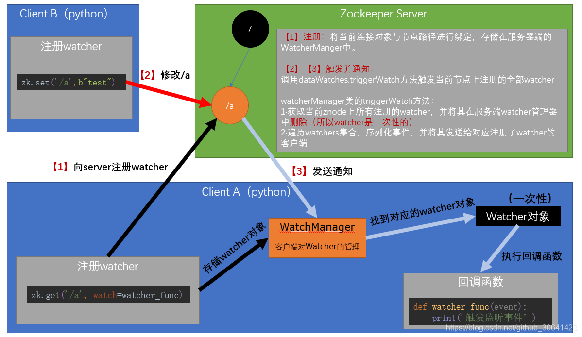 (即客户端向服务端注册监听,并将watcher对象存在客户端的Watchermanager中,服务端触发事件后,向客户端发送通知,客户端收到通知后从wacherManager中取出对象来执行回调逻辑)