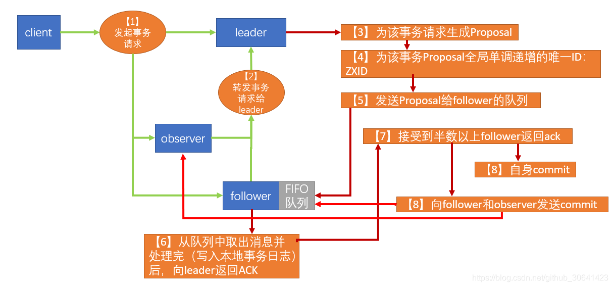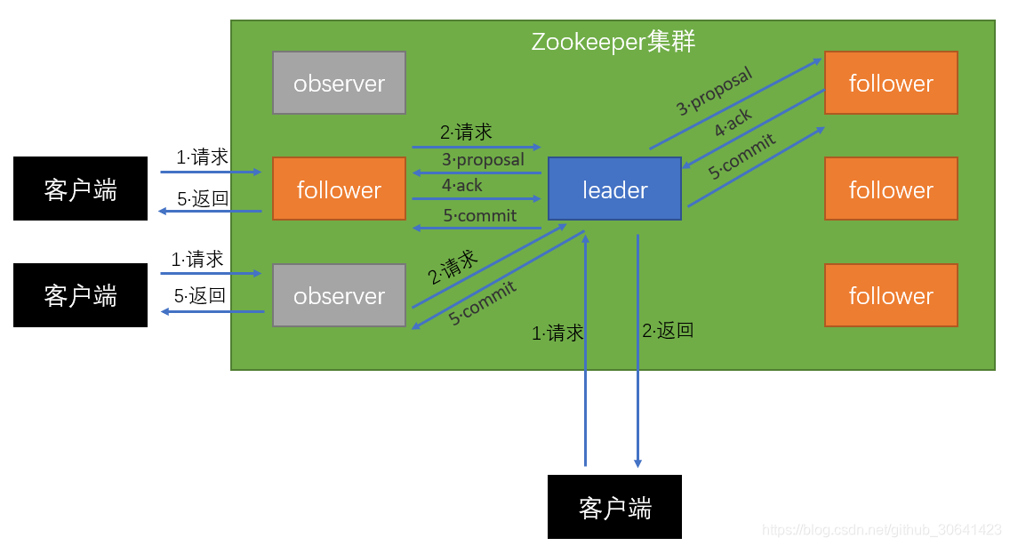 根据ZAB协议,所有的写操作都必须通过leader来完成,leader写入本地日志后再复制到所有的follower节点。如果客户端对follower/observer发起写请求,follower/observer会将请求转发到leader,然后由leader处理完成后再将结果转发回follower/observer发送给客户端。