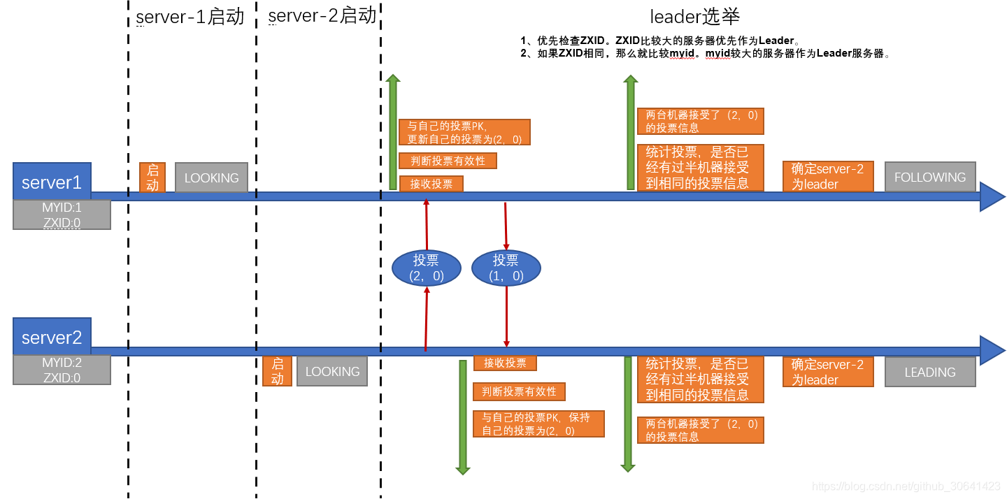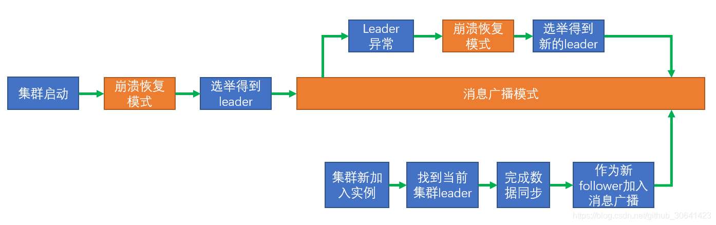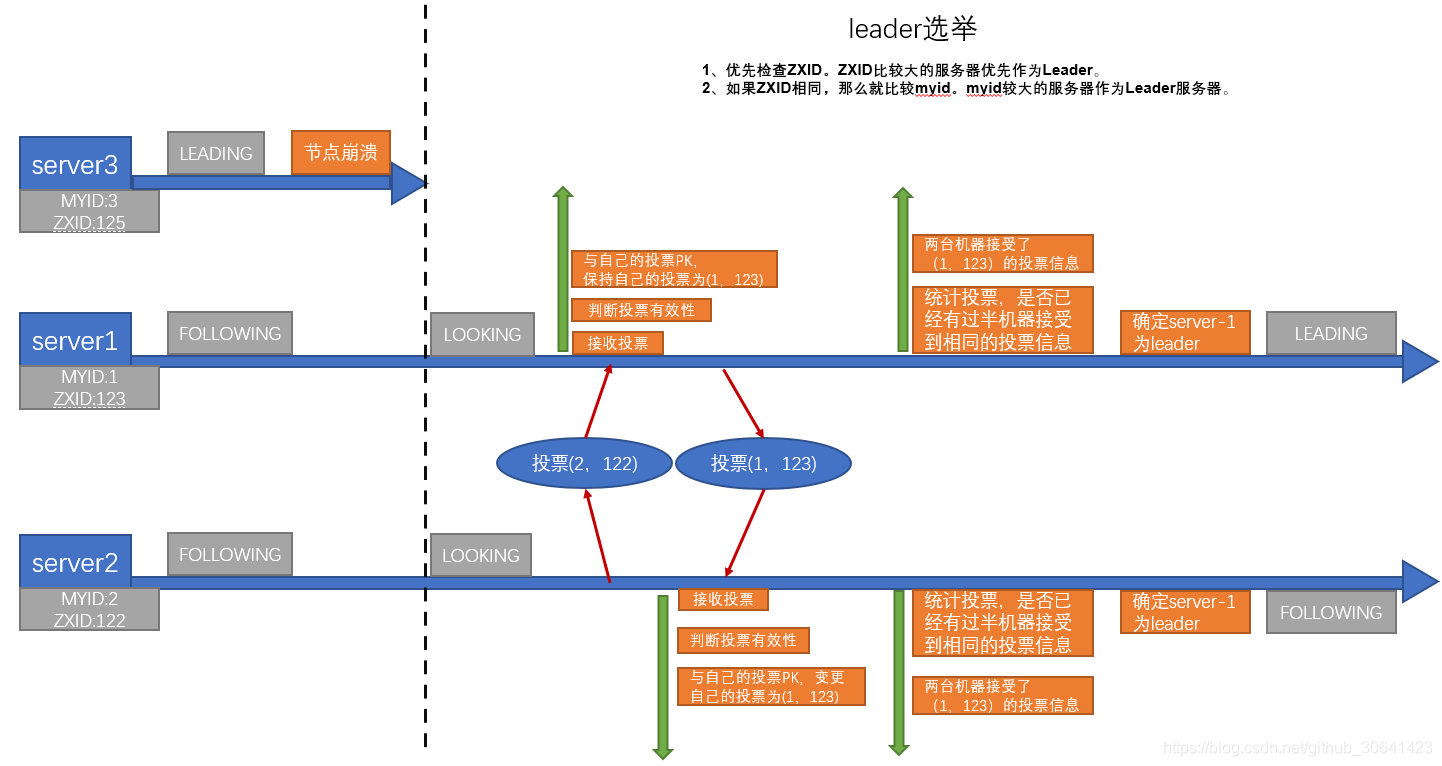 集群运行期间因为leader节点崩溃会导致leader的选举,整体和集群启动时的leader选举差不多,示意图如下
