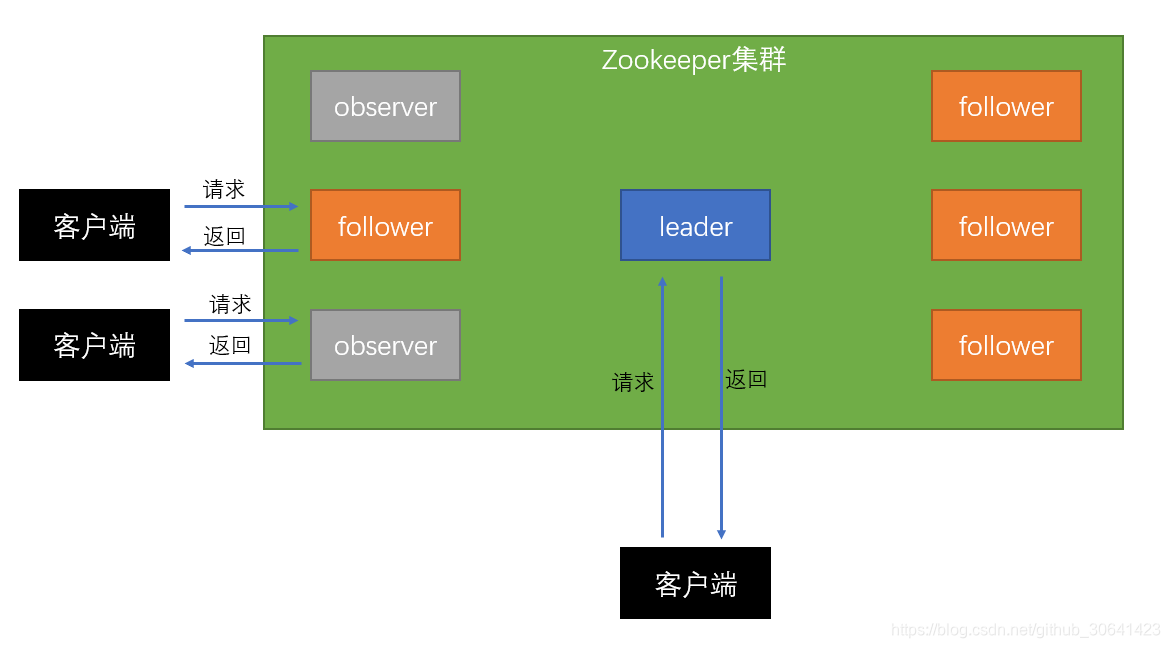| learner | follower | 接受客户端连接,可直接处理读请求,写请求会转发给leader处理;follower还要处理leader的提议,并在leader提交该提议时在本地也进行提交;并参与leader选举 |