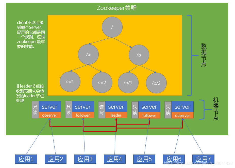 | leader | 负责系统的写请求,事务请求的唯一调度和处理者,保证集群事务处理的顺序性。集群内部各服务器的调度者。 | |