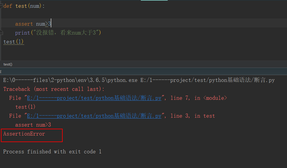 def test(num): assert num>3 print("没报错,看来num大于3") test(1)