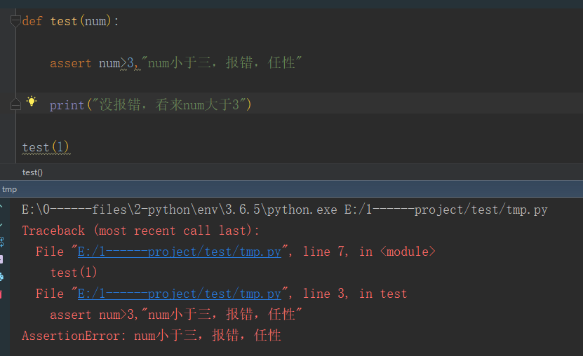 def test(num): assert num>3,"num小于三,报错,任性" print("没报错,看来num大于3") test(1)
