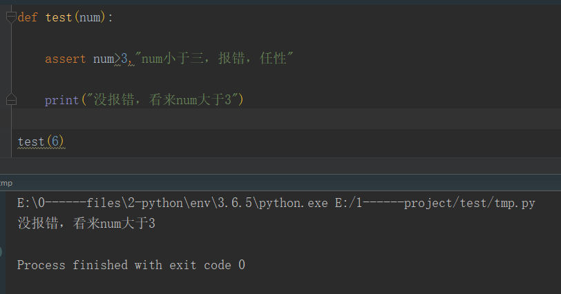 def test(num): assert num>3,"num小于三,报错,任性" print("没报错,看来num大于3") test(6)