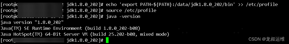 echo 'export PATH=${PATH}:/data/jdk1.8.0_202/bin' >> /etc/profile
