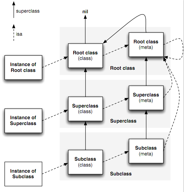 所有的metaclass中isa指针都是指向根metaclass,而根metaclass则指向自身。根metaclass是通过继承根类产生的,与根class结构体成员一致,不同的是根metaclass的isa指针指向自身。