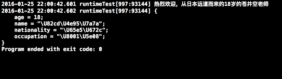 相信通过前面的学习,这些代码不用写过多的注释你也可以看懂了,我把假设是网络返回的苍老师的资料转化为了model,然后又将model转回字典。这是一个JSON转Model相互转换的一个思路,大家稍后运行Demo细细品味。