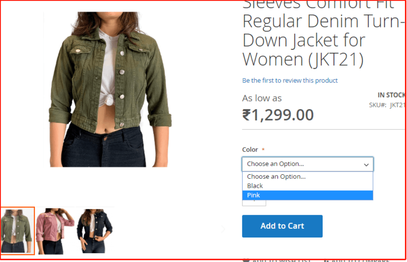 例如-牛仔全袖夹克是一种可配置的产品,因为它有不同的颜色和尺寸可供选择。