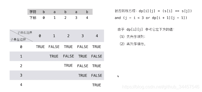 对角线为单个字符,肯定是true,左右边界确定下来,只需要填表格上半部分,0-1为ba所以是false,0-2为bab为true,依次类推