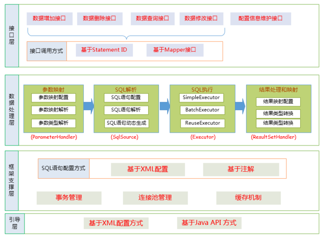 基础支撑层:负责最基础的功能支撑,包括连接管理、事务管理、配置加载和缓存处理,这些都是共用的东西,将他们抽取出来作为最基础的组件。为上层的数据处理层提供最基础的支撑。