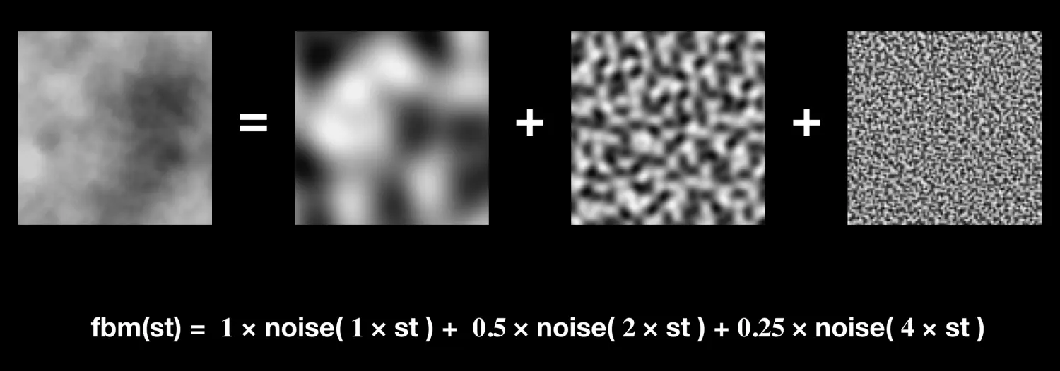fbm = noise(st) + 0.5 * noise(2*st) + 0.25 * noise(4*st)