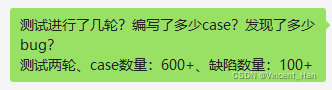 二、项目的周期开发测试比、测试了多少轮、总共有多少个case、你自己写了多少个case、发现了多少个bug