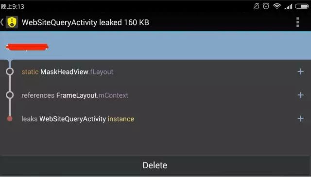 集成后什么都不用做,按照正常测试,当有内存泄漏发生后,应用会通过系统通知栏发出通知,点击通知就可以进入查看内存泄漏的具体信息。在这里举个实践中的例子。把LeakCanary集成到项目中后,等App启动后一会,系统通知到了,点击通知,跳转到泄漏的详情页面进行查看: