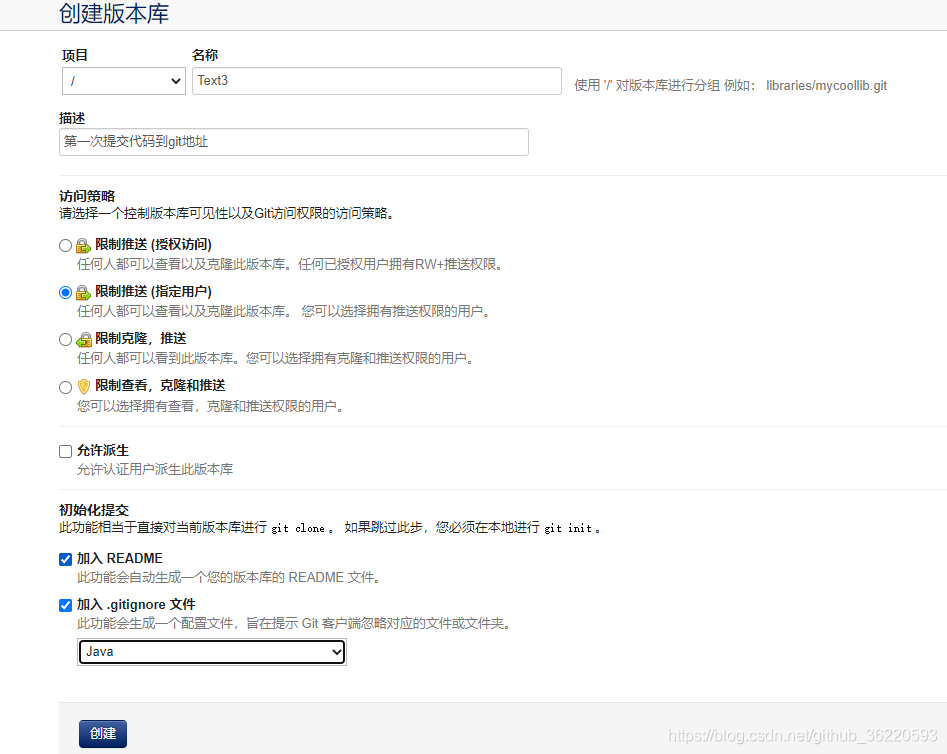 1、先搭建好本地的gitblit仓库/直接使用现有的git仓库地址,图1为本人新建代码库,点击新建即可创建成功