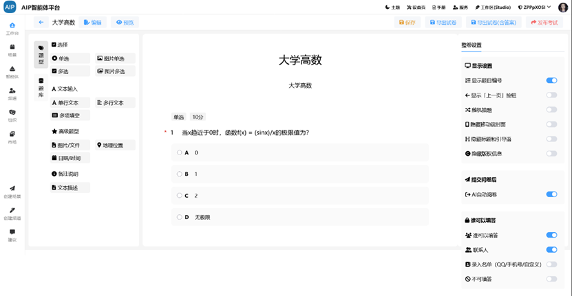 AIP智能体平台在新建试卷时,提供了极为丰富的题型选择。从常见的单选、多选,到需要文字作答的单行文本、多行文本,再到较为特殊的图片单选、图片多选、多项填空等题型,一应俱全。这使得教师在创建试卷时,能够根据不同学科的特点和考核要求,灵活地组合各种题型,全面考查学生对知识的掌握程度和综合运用能力。