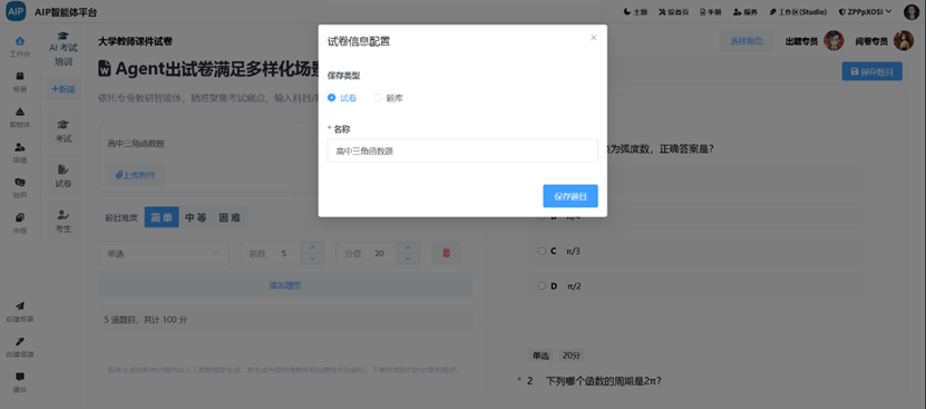 此外,AIP智能体平台支持多种保存类型,教师可根据实际需求将题目保存为试卷或题库。保存为试卷可直接应用于考试,保存为题库则便于教师日后对题目进行整理与复用。这种灵活的保存方式,进一步提升了教师的出题效率与资源利用率。
