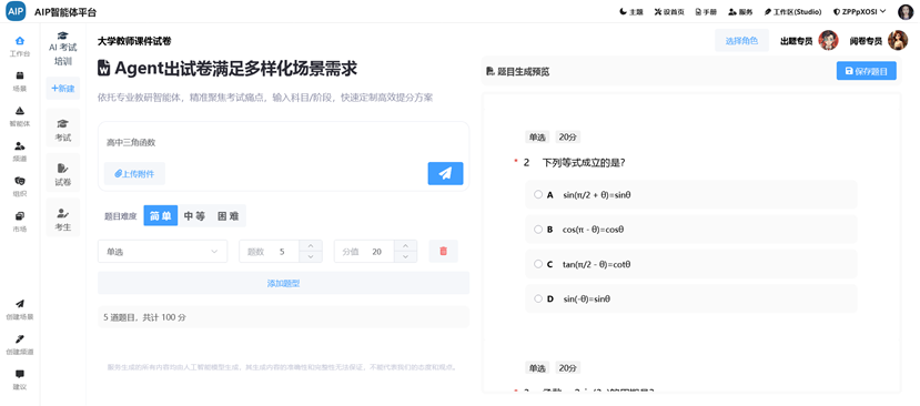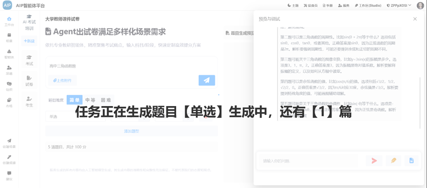 以高中数学三角函数题为例,教师仅需在平台上输入相关知识点及难度要求,AIP智能体便可迅速生成一系列高质量题目。这些题目不仅全面覆盖三角函数的各个考点,还具备合理的难度梯度与科学的选项设置。教师可依据自身教学需求,对生成的题目进行进一步筛选与调整,显著提高出题效率。