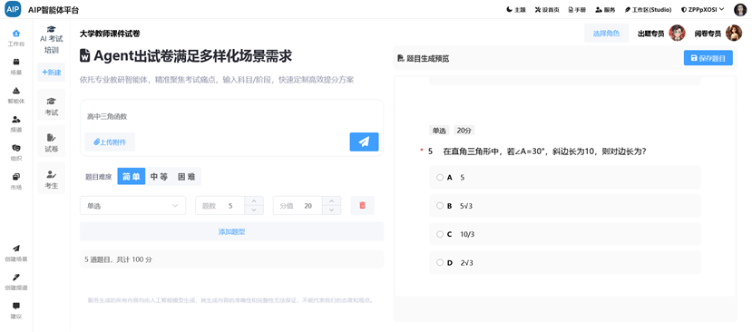 AIP智能体平台广泛适用于广大教育工作者,涵盖中小学教师、大学教师以及培训机构教师等。对于中小学教师而言,平台的简洁易用与多样化功能,有助于他们快速生成试卷,满足日常教学与考试需求;对于大学教师来说,平台的高级题型与灵活设置,能够满足其对专业课程考试的高标准要求;对于培训机构教师而言,平台的便捷性与高效性,可助力他们迅速响应市场需求,推出高质量培训课程。