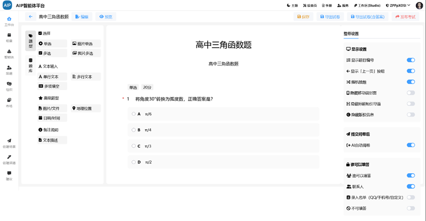 在出题类型方面,平台提供单选、多选、文本输入等多种题型。教师可依据教学内容与学生实际情况,灵活选取合适的题型,增强试卷的针对性与有效性。例如,在考查学生对三角函数基本概念的理解时,可选用单选题;而在考查学生对三角函数综合应用能力时,可采用多选题或文本输入题。