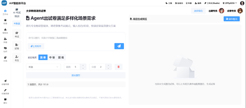 AIP智能体的出题页面巧妙地设置了“选择角色”功能,将出题专员和阅卷专员的工作清晰地划分开来。出题专员可以全身心地投入到题目设计中,无需再为后续的阅卷工作分心。他们可以根据不同的科目、不同的教学阶段以及不同的学生水平,精准地把握考试的难点和重点,设计出既符合教学要求又能有效考查学生知识掌握程度的题目。无论是基础题、中等题还是难题,出题专员都能在AIP智能体的辅助下,快速、高效地完成题目创作。