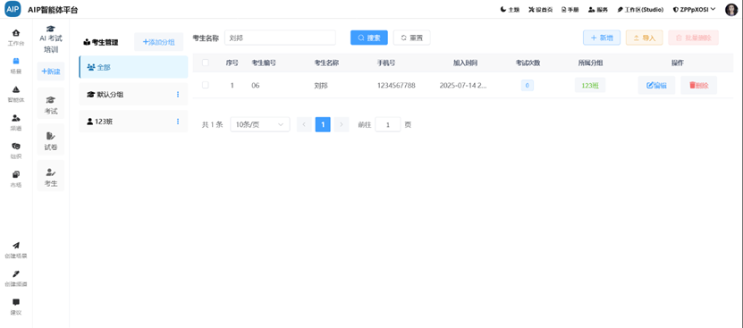 AIP智能平台的考生管理模块,是教师掌握学生考试参与情况的重要窗口。平台将考生的每次考试记录都进行了精准的统计与留存,在考生管理界面,“考试次数”这一关键数据清晰呈现。无论是单个学生参加考试的频次,还是班级整体的考试参与情况,都能通过平台一目了然。