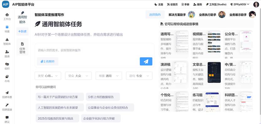 AIP智能体平台的受众分层功能,覆盖“老板、面试官、员工、同事同行”等多元人群,适配职场汇报、客户沟通、团队协作等场景。对职场人来说,给老板写项目申请,用“决策层沟通”逻辑,突出“项目能带来的战略价值与ROI”;给新员工做培训材料,切换到“学习者视角”,语言更通俗易懂、步骤清晰。