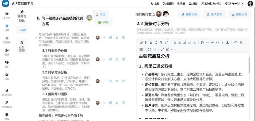 从效率层面看,以往撰写一份专业分析报告,可能需要花费数天时间收集资料、梳理逻辑、组织语言。现在借助平台,输入需求,智能体快速响应,短时间内就能产出初稿,大大缩短工作周期。比如市场部要应对突发的营销活动策划,借助平台“写一篇关于产品营销的计划方案”,几分钟就能得到有框架、有思路的内容,后续只需根据实际情况微调,就能投入使用,让团队快速抓住市场机遇。