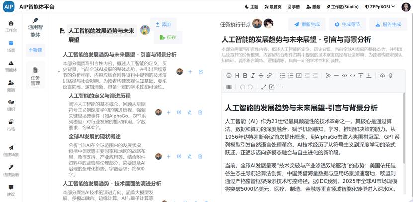 在写关于“人工智能的发展趋势与未来展望”这类内容时,智能体不会生硬罗列数据与观点,而是结合行业动态、实际应用案例,用连贯、有思考深度的文字,展现对未来的预判,让内容既有专业度又具备可读性,仿佛是一位行业资深人士在分享见解;制作视频脚本时,它规划的镜头语言与叙事节奏,贴合观众情感需求,能唤起共鸣,就像经验丰富的编导在构思作品。