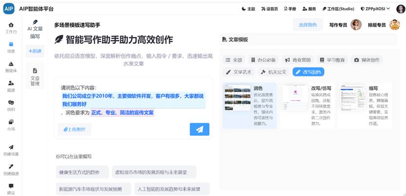 在如今信息爆炸的时代,无论是企业宣传、学术创作,还是日常写作,一篇优质的文章都至关重要。然而,并非人人都能轻松驾驭文字,写出精彩绝伦的内容。好在,AIP智能体平台的出现,为文字创作带来了新的曙光,尤其是其强大的文章润色功能,更是为众多写作者提供了得力的助手。