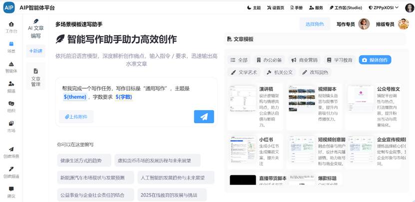 AIP智能体适用于文章写作、长文档编写、考试培训等多种场景。在文章写作场景中,为用户提供丰富写作灵感与素材,助力创作出引人入胜的作品;长文档编写时,协助进行排版与格式调整,提升文档专业性与可读性;考试培训场景下,提供模拟试题与学习资料,助力用户备考。