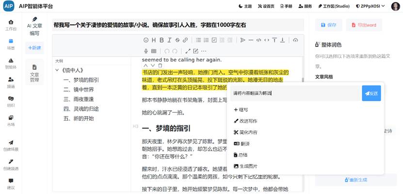 作家、编剧、艺术家等文化创作者常需进行跨文化创作与交流,AIP智能体的多语翻译功能可将其作品翻译成不同语言,传播至全球。同时,为其提供创作灵感与素材,丰富创作内容。