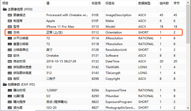 二狗子在网上找了一款可以查看修改图片 EXIF 的工具,先打开图片查看 Orientation 信息。