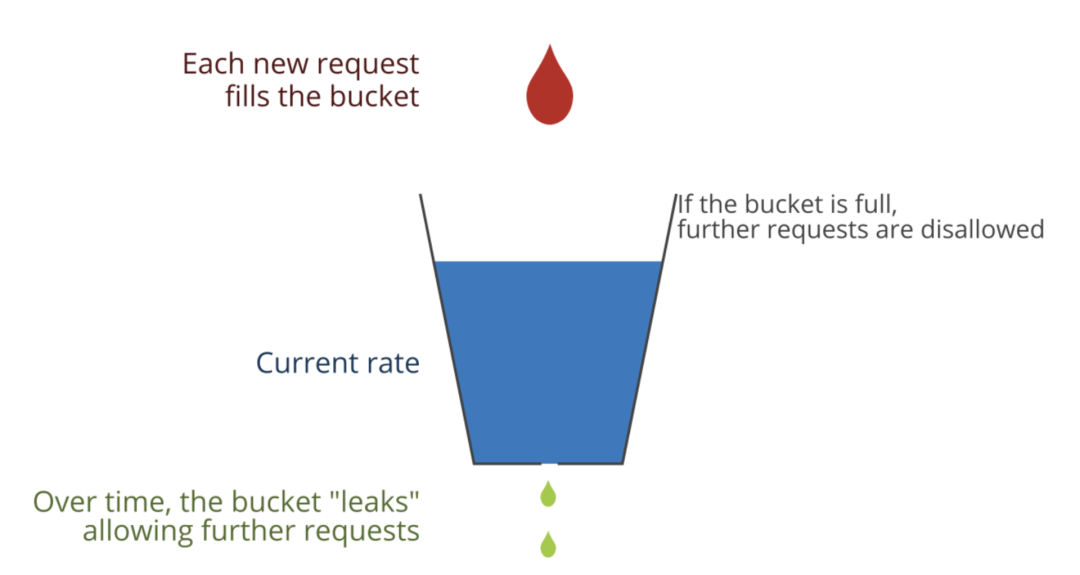 如上图所示,用户请求都被放进桶里,当桶满了以后,请求会被拒绝掉。桶的底部有一个孔,请求会以一定的速率被放过,比如说现在是限制每分钟 10 个请求,意味着每隔 6 秒钟就会有一个请求通过。漏桶算法的特点在于其通过请求的速率是恒定的,可以将流量整形的非常均匀,即便同时有 100 个请求也不会一次性通过,而是按一定间隔慢慢放行,这对后端服务迎接突发流量非常友好。