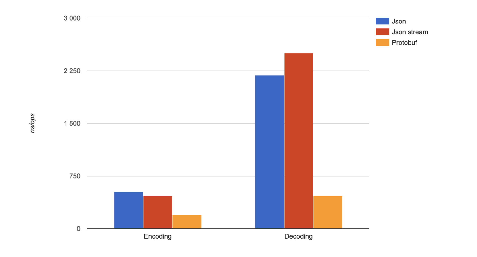 上图是 Protobuf 与 JSON 以及 JSON stream 三者之间的性能比较,可以明显的看到在解码的时候 Protobuf 比其他两项快了不只一星半点。