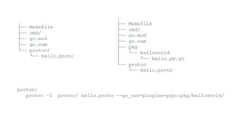 定义完成后 ,下一步就是使用 protoc 命令行工具生成代码。下图左侧是初始化的项目,你会发现,有一个单独的目录 protoc,存放了 hello.proto 这个文件,这个文件就是前面定义好的。