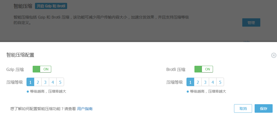 又拍云智能压缩功能旨在为网站减少了流量开支,减少资源加载时间,让终端用户的体验更上一层楼。它同时支持 Gzip 和 Brotli 压缩算法,可同时开启,也可开启其中一种。开启该功能,可对静态文件类型进行压缩,有效减少用户传输内容大小,加速分发效果。为了配置的灵活性,“智能压缩”功能支持压缩等级(1 到 5)的设置。两种压缩算法的压缩等级默认为 1,等级越高,压缩率越大。考虑到压缩等级越高,压缩速度会降低,实际生产环境,建议压缩等级控制在 3 以内,具体请以线上环境实测为准进行自主设置。