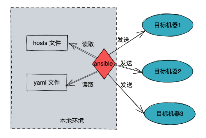 Ansible 原理示意图如上,我们需要关注以下 3 点就能掌握 Ansible 的大致原理。第一,hosts 配置文件的作用是告诉 Ansible 你的程序要部署到哪些机器;第二,yaml 文件的作用是告诉 Ansible 在目标机器上执行哪些操作。第三,Ansible 不需要在目标机器上安装客户端,它通过 SSH 把指令和要部署的程序发送到目标机器上。
