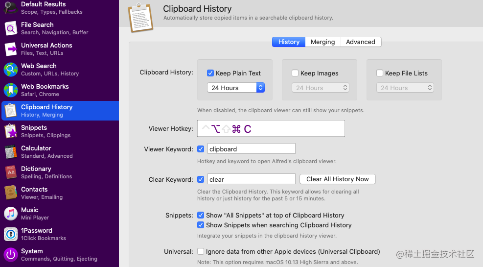 Alfred 的常用基础功能为查询文档、指定网站搜索、剪切板历史、集成 iTerm2、计算机字典翻译、集成 1password、系统功能、放大显示内容等等 。 接下来挑选其中几个为大家做简单展示。